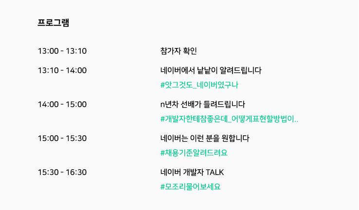 이번 네이버 오픈 클래스를 통해 선배 개발자들의 노하우를 듣고 채용 포인트를 알게 되어서 유익한 시간을 보낼 수 있었습니다. 또한, 네이버가 정말 개발자가 일하기 좋은 환경이라는 걸 다시 한번 느꼈습니다.