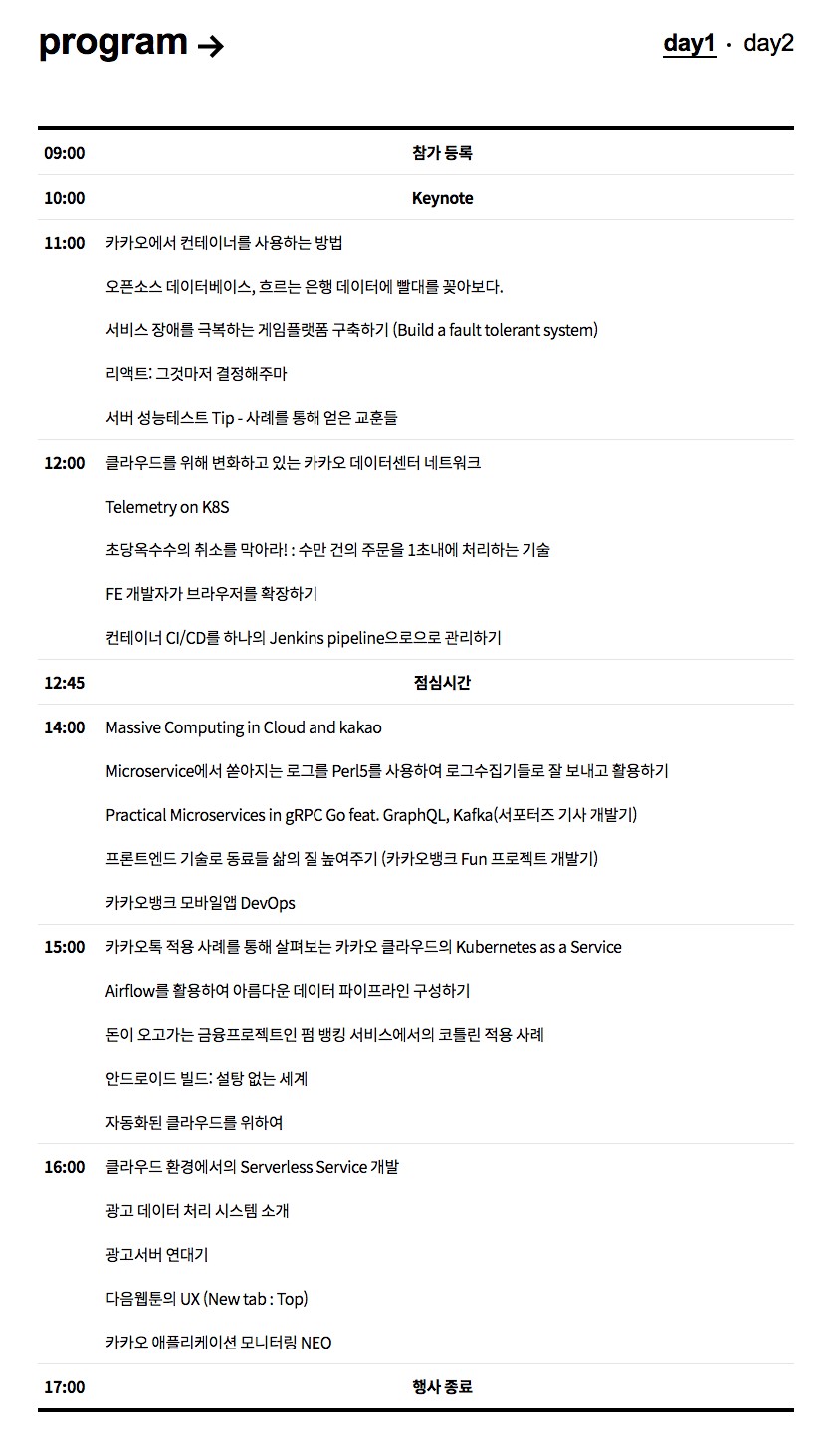 각 분야별, 계열사 별로 다양한 발표가 마련되어 있었는데요, 저는 서버 개발자이기 때문에 서버 쪽 발표를 선택했습니다.