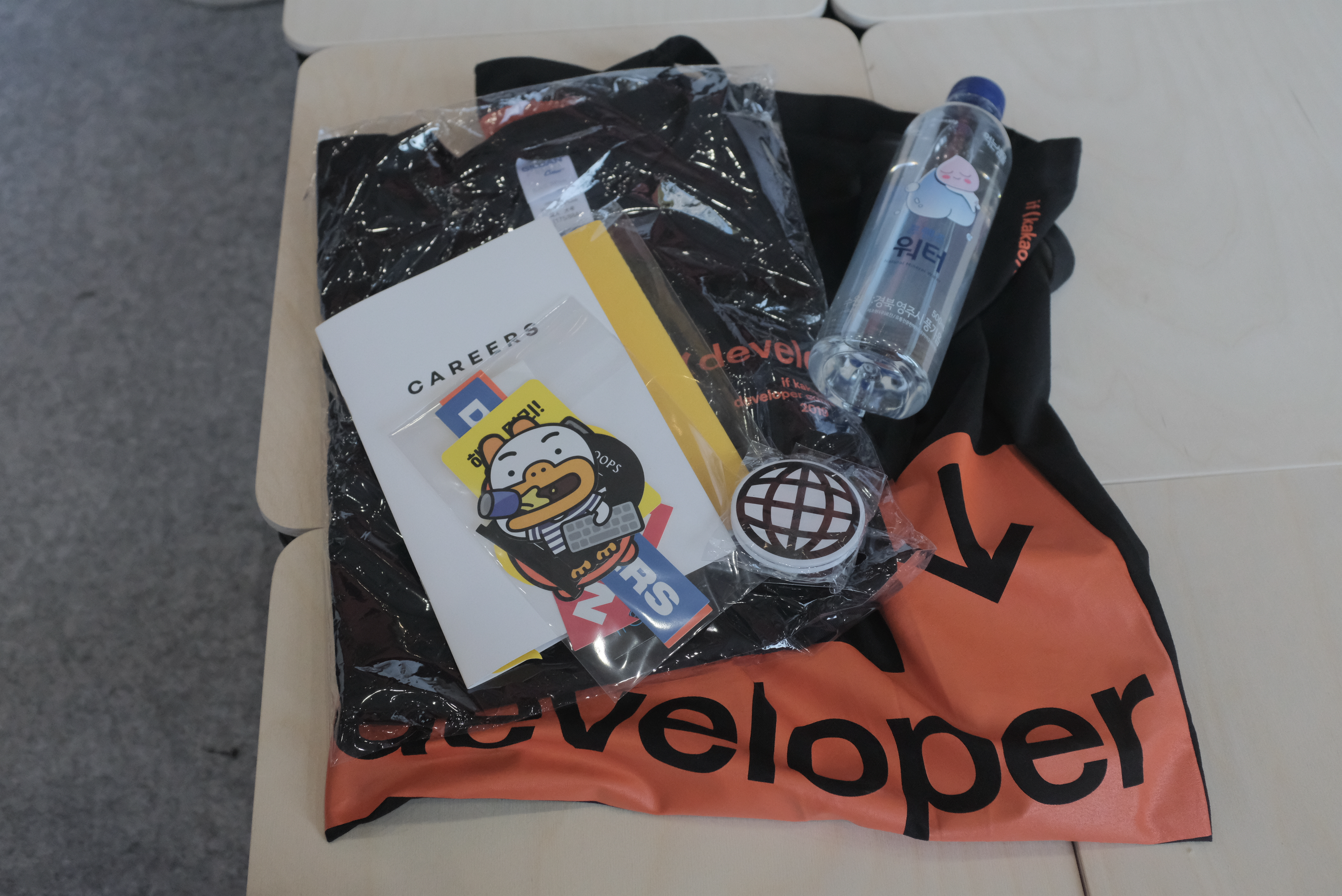 그리고 컨퍼런스의 묘미, 굿즈도 받았어요. 사실 컨퍼런스는 이런 재미로 가는 거죠! 에코백 안에 스티커, 카카오 서비스 할인 쿠폰, 어피치 생수, 티셔츠, 뱃지 등등이 들어있었습니다.